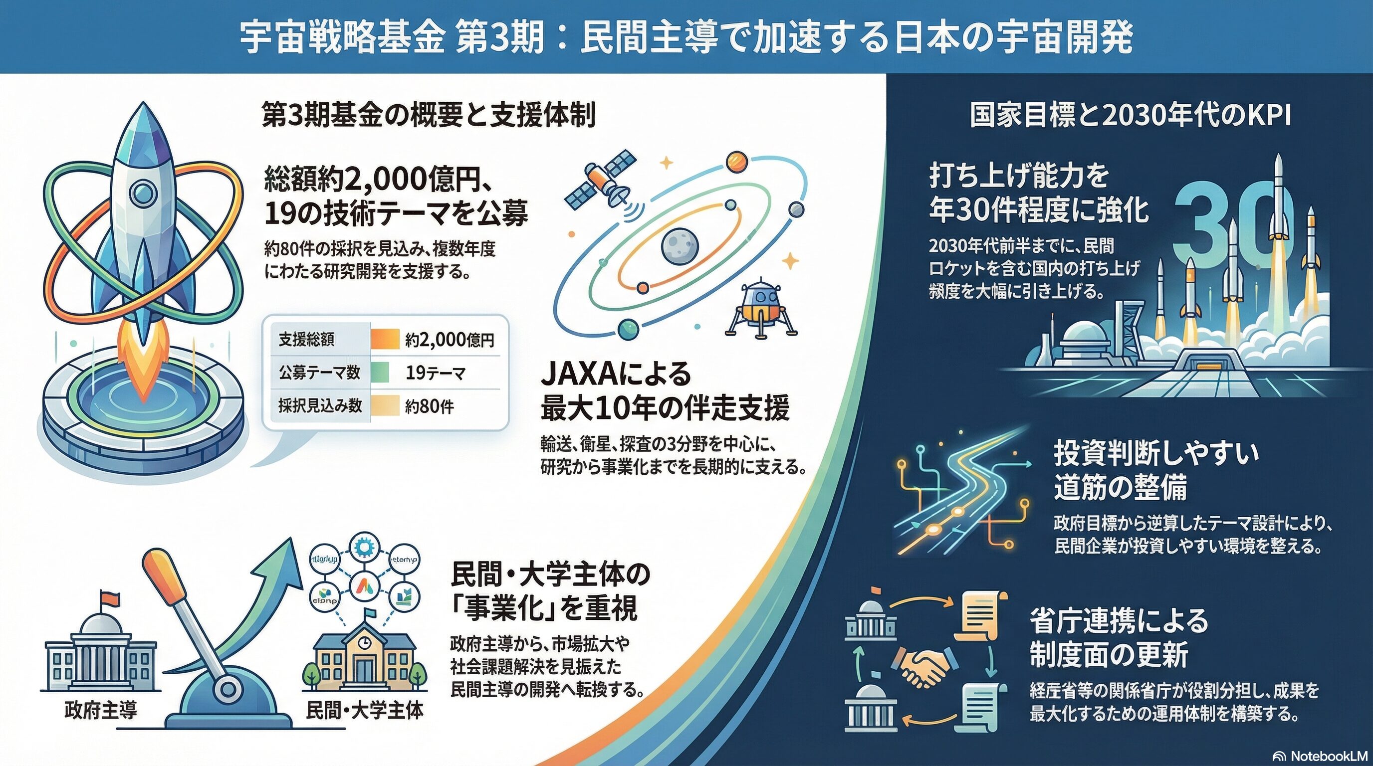 また、制度面は更新が続く。経済産業省は昨年3月、基本方針の改定と第2期の技術開発テーマ策定を公表しており、関係省庁が役割分担しながらテーマを組み立てる姿勢を示している。第3期でも、省庁側の狙いとJAXAの審査・伴走の運用がかみ合うかが、採択後の成果に直結する。